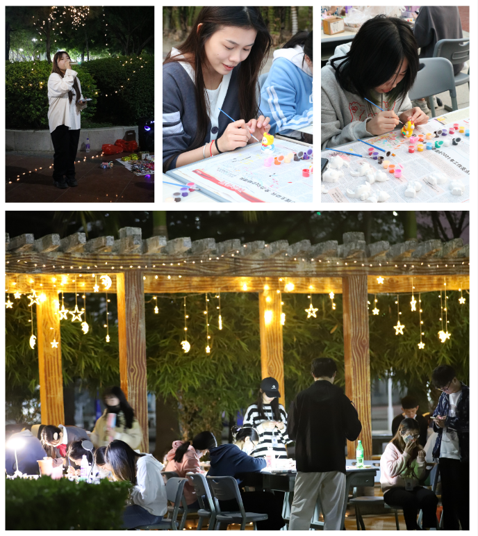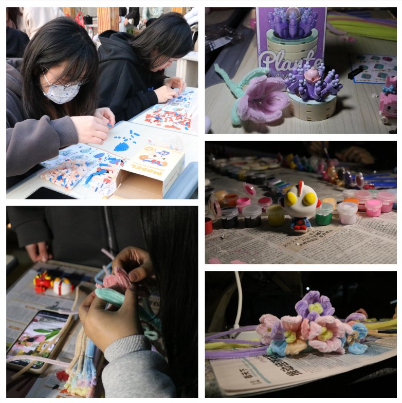 活动现场,同学们通过热身小游戏“步步为赢”或“才艺秀”等活跃气氛,接着根据自己的喜好选择可以根据自身喜好填涂颜色的“石膏娃娃”、或者可以充分发挥自己创新创造能力的“扭扭棒”,亦或是考验耐心与细心的“小积木”等,经过女神们魔法般的巧手,或裁剪或填涂或拼接或粘贴固定等工序,一个个美丽可爱又独特的作品组建诞生。