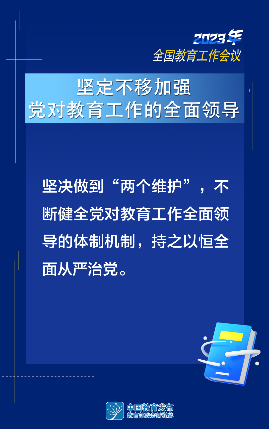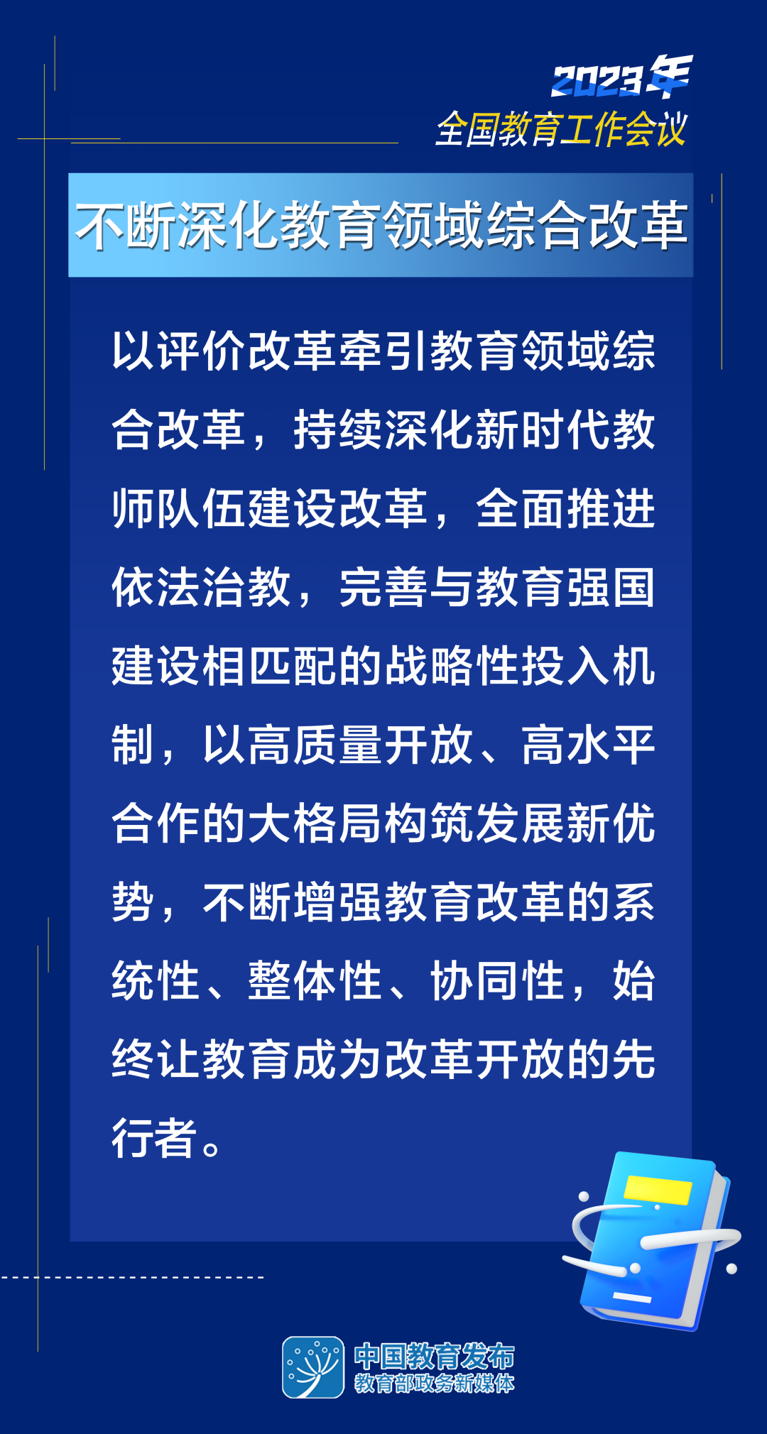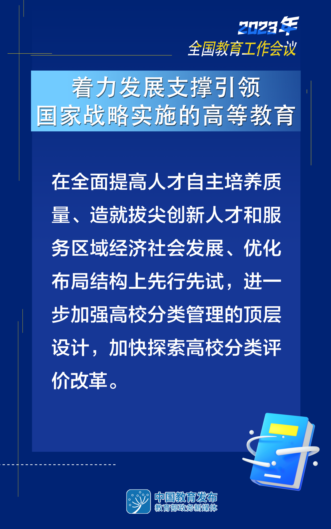 怀进鹏强调,2023年是全面贯彻落实党的二十大精神的开局之年,各项工作要着力在开局上做文章,开辟新赛道,做出新优势。一是谋划教育强国战略。组织实施建设教育强国战略谋划工程,立足党和国家事业的大格局,置身世界教育强国的大坐标,系统谋划教育强国建设的基本思路、战略目标、主要任务和重大举措,搭建起教育强国建设的“四梁八柱”。二是全面提高人才自主培养质量,发挥好教育在现代化建设中的人才支撑作用。推动职业教育与产业经济发展有效融合,促进人的培养和成长与经济社会发展、产业转型升级相协调、相融合。推动高等教育在全面提高人才自主培养质量、造就拔尖创新人才和服务区域经济社会发展、优化结构布局上先行先试,探索实施分类评价。三是进一步提升基础教育质量。加快教育优质均衡发展,推进三全育人,发挥基础教育在教育强国建设中的基础性、支撑性作用,促进青少年德智体美劳全面发展和健康成长。四是加快和扩大高水平教育对外开放。自信自立自强,更加精准实施教育、科技、人才国际交流合作,进一步拓宽人才培养国际化路径,更好扩大中国教育国际影响力,服务推动构建人类命运共同体。五是做好新阶段疫情防控工作。保健康、防重症,进一步细化工作方案和应急预案,确保有效应对疫情高峰,充足做好新学期开学疫情防控条件保障,做好师生思想引导、心理疏导、行为指导等工作,强化与卫健、疾控等部门的沟通协作,保障医药供应和就医绿色通道。