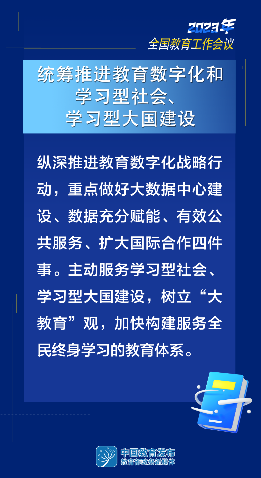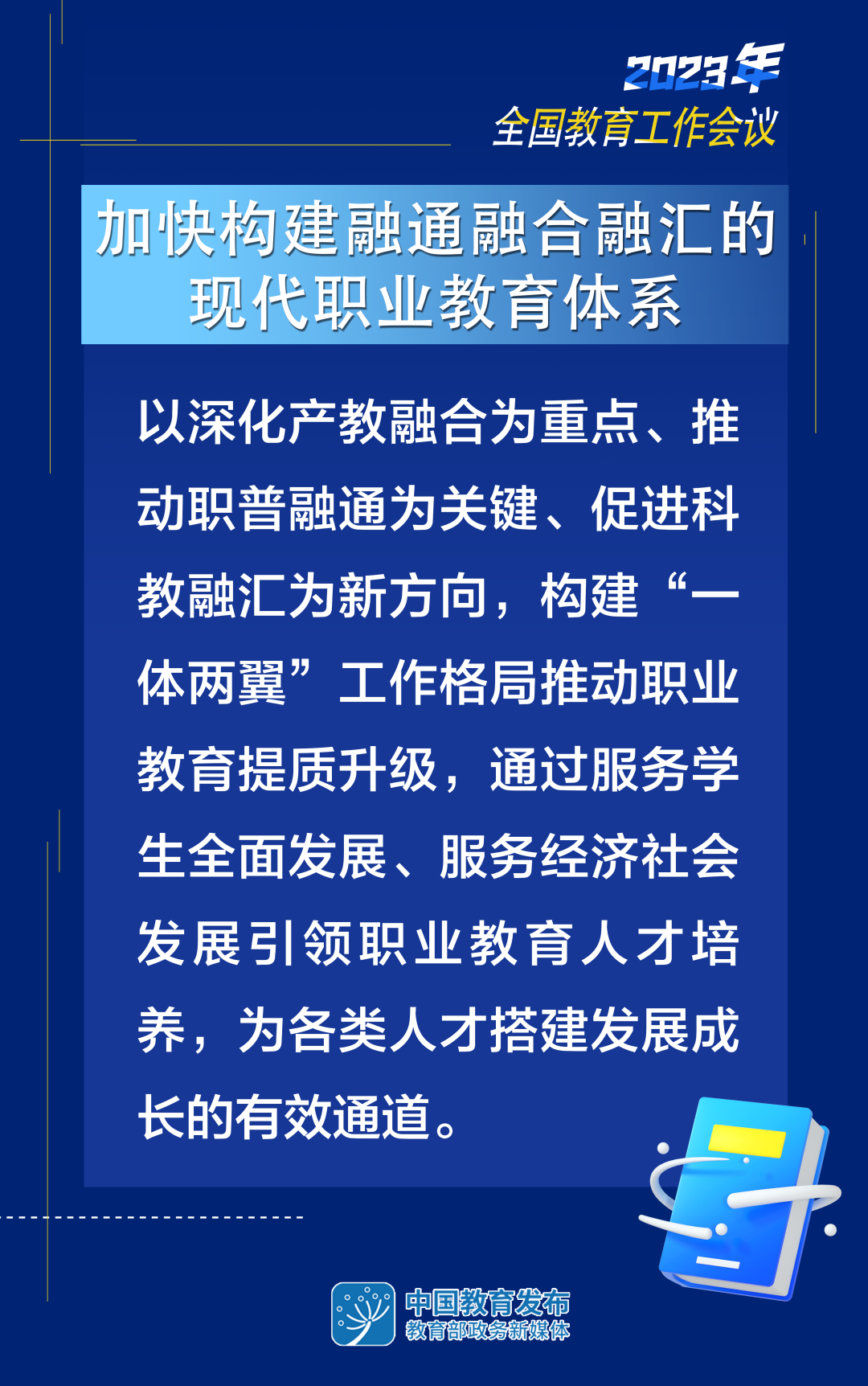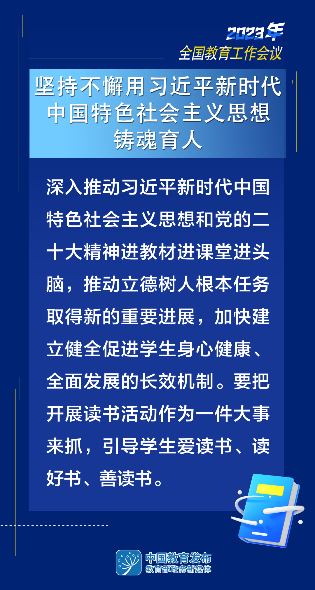 怀进鹏强调,2023年是全面贯彻落实党的二十大精神的开局之年,各项工作要着力在开局上做文章,开辟新赛道,做出新优势。一是谋划教育强国战略。组织实施建设教育强国战略谋划工程,立足党和国家事业的大格局,置身世界教育强国的大坐标,系统谋划教育强国建设的基本思路、战略目标、主要任务和重大举措,搭建起教育强国建设的“四梁八柱”。二是全面提高人才自主培养质量,发挥好教育在现代化建设中的人才支撑作用。推动职业教育与产业经济发展有效融合,促进人的培养和成长与经济社会发展、产业转型升级相协调、相融合。推动高等教育在全面提高人才自主培养质量、造就拔尖创新人才和服务区域经济社会发展、优化结构布局上先行先试,探索实施分类评价。三是进一步提升基础教育质量。加快教育优质均衡发展,推进三全育人,发挥基础教育在教育强国建设中的基础性、支撑性作用,促进青少年德智体美劳全面发展和健康成长。四是加快和扩大高水平教育对外开放。自信自立自强,更加精准实施教育、科技、人才国际交流合作,进一步拓宽人才培养国际化路径,更好扩大中国教育国际影响力,服务推动构建人类命运共同体。五是做好新阶段疫情防控工作。保健康、防重症,进一步细化工作方案和应急预案,确保有效应对疫情高峰,充足做好新学期开学疫情防控条件保障,做好师生思想引导、心理疏导、行为指导等工作,强化与卫健、疾控等部门的沟通协作,保障医药供应和就医绿色通道。