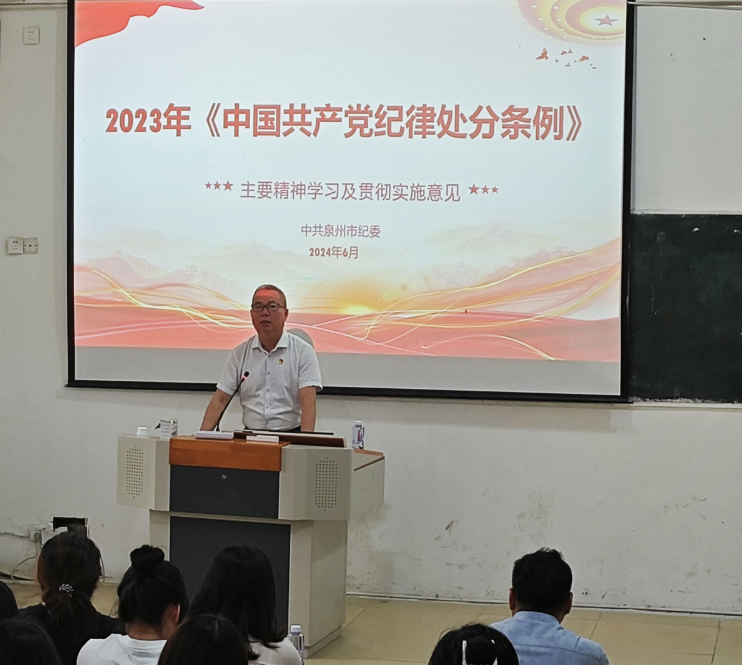 为进一步加强党员党性教育,增强全体党员纪律意识,推进党纪学习教育走深走实走细,6月18日下午,学院党委委员、副院长沈永希在西教一楼东梯为我系党总支全体党员和入党积极分子讲授党纪学习教育专题党课。