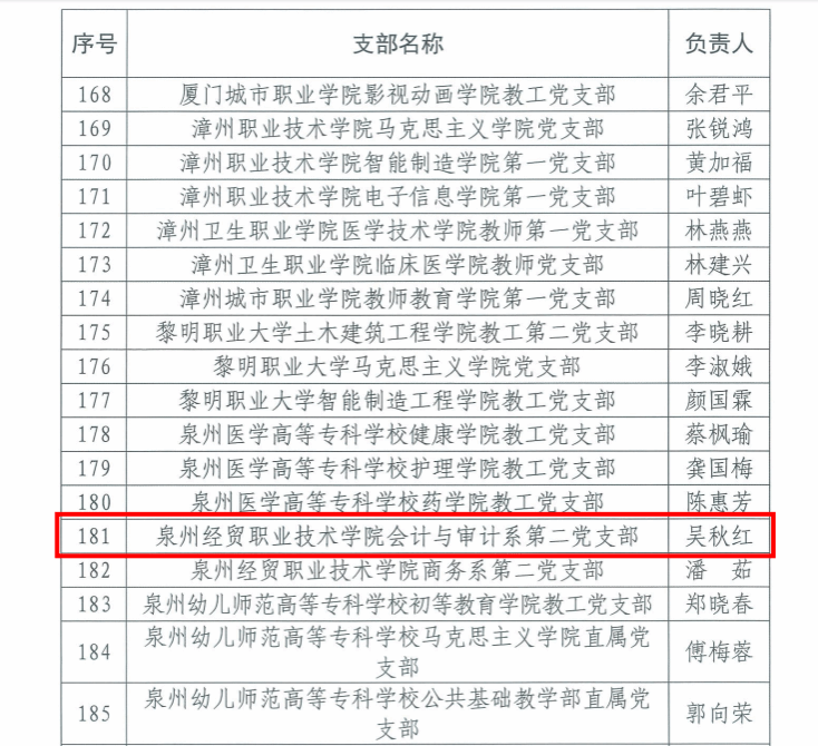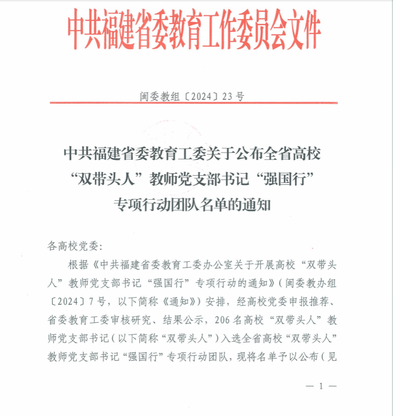 10月16日,根据《中共福建省委教育工委关于公布全省高校“双带头人”教师党支部书记“强国行’专项行动团队名单的通知》(闽委教组[2024]23号)文件,我系第二党支部(负责人:吴秋红老师)成功入选全省高校“双带头人”教师党支部书记“强国行”专项行动团队。此项行动旨在以高质量党建引领高质量发展,充分发挥教师党支部战斗堡垒作用和党员先锋模范作用,不断强化“双带头人”队伍建设和作用发挥,引领广大师生在服务福建省重大战略和地方经济社会高质量发展中作出更大贡献。