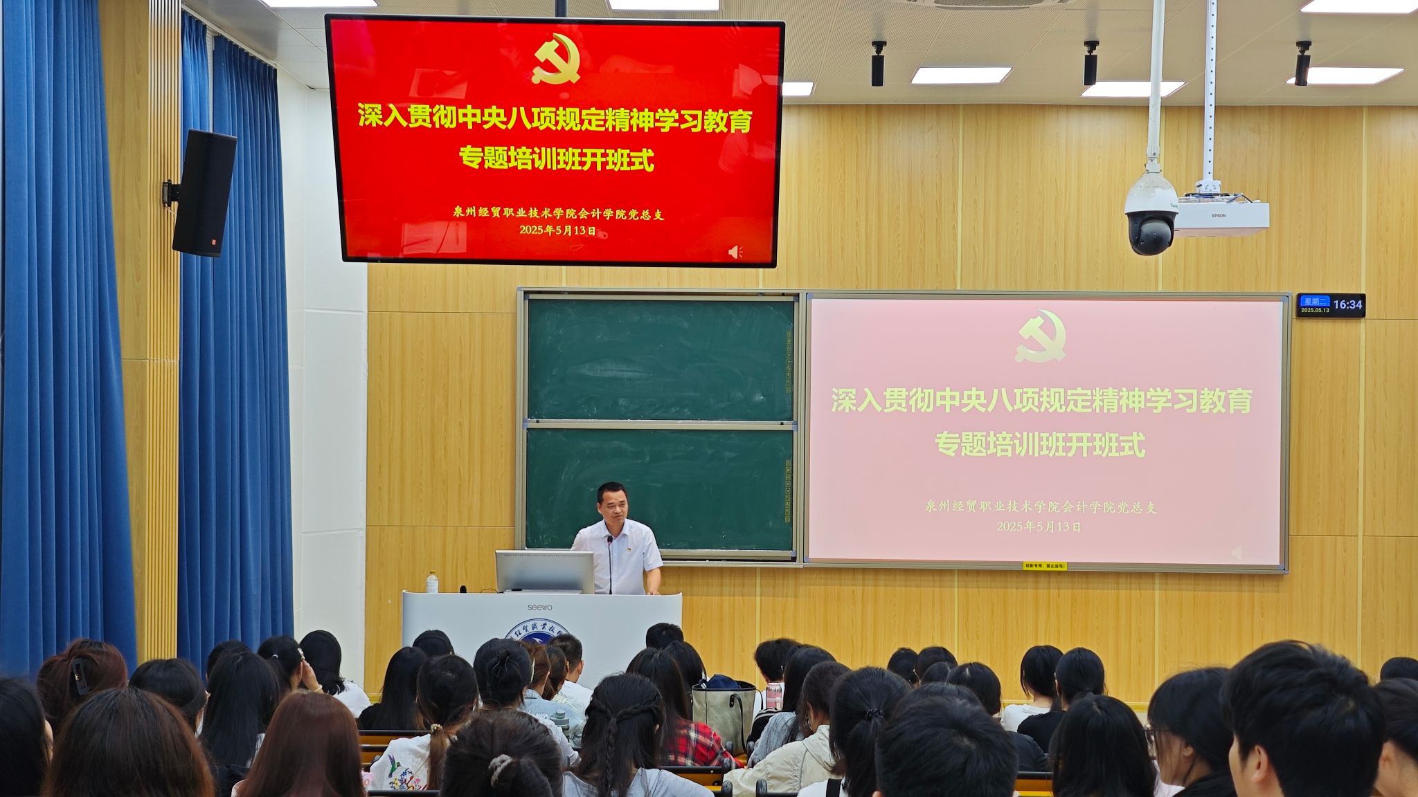 开班式后,会计学院党总支副书记杜石清以《严格落实中央八项规定及其实施细则精神 推动党的作风持续向好》为题,为党员和入党积极分子上专题党课。他详细阐述了深入贯彻中央八项规定精神学习教育的重大意义,传达了违反中央八项规定及其实施细则精神的典型案例,用真实案例敲响纪律警钟,让党员们深刻认识到违反中央八项规定精神的严重后果,教育引导党员干部要深刻汲取教训,以案为鉴、以案促改,把遵规守纪融入日常工作和生活中。