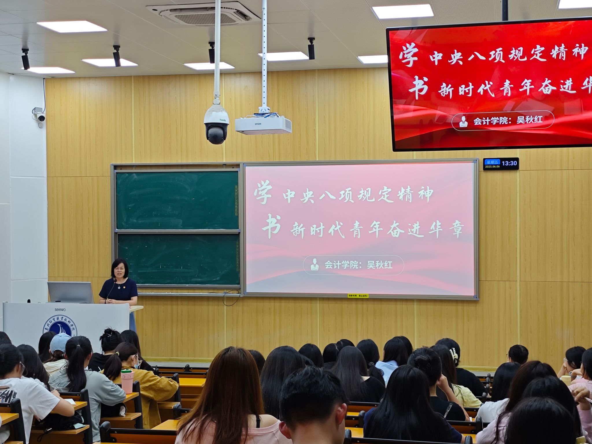 5月20日和6月6日,会计学院第一党支部书记林秋双、第二党支部书记吴秋红分别为党支部的全体党员和入党积极分子上深入贯彻中央八项规定精神学习教育专题党课。