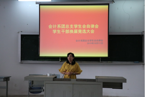 2019年10月11号下午14:00,会计系团总支、学生会、自律会在新教101举行了学生干部换届竞选大会。会计系团总支书记吕丹华老师以及会计系团总支、学生会、自律会全体成员参加了此次大会。