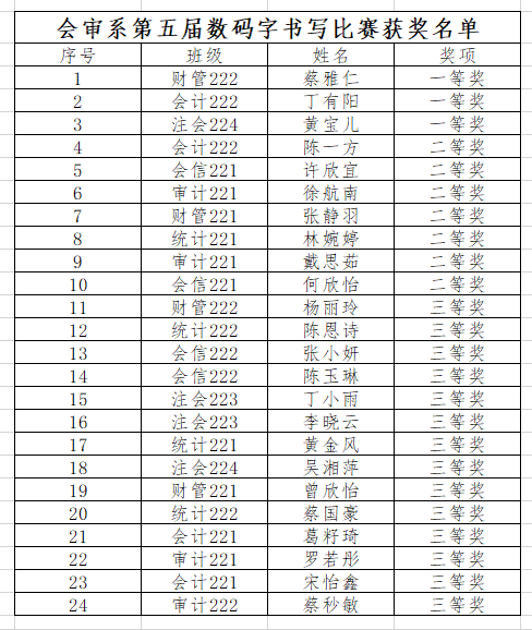 开展此项赛事,旨在强化“以赛促教、以赛促学、以赛促练”,展示了学生熟练的数码字书写技能水平,提高了学生专业实践能力和动手能力,也提升了学生综合素养。今后,会审系将继续强化学生专业实践能力训练,全面提升会计专业综合应用能力,扎实推进专业高质量发展。