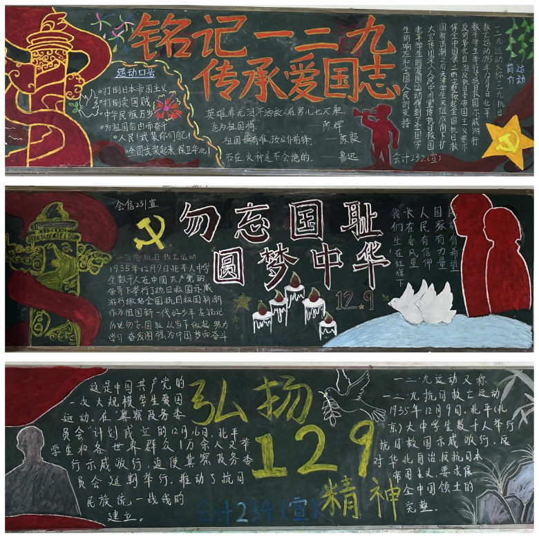 组织开展一场主题黑板报评比活动。各班同学积极参加,黑板报形式多样、设计精美,将爱国主义精神与时代元素紧密结合起来,一幅幅作品主题鲜明、内容丰富,饱含青年学子的浓浓爱党情、拳拳报国志。