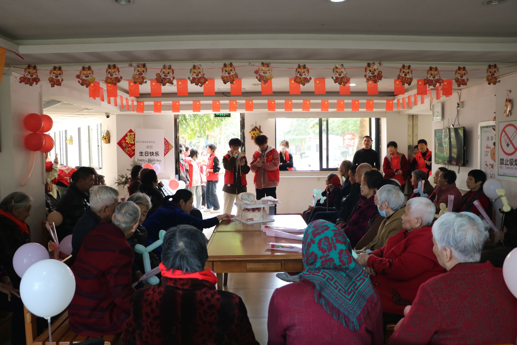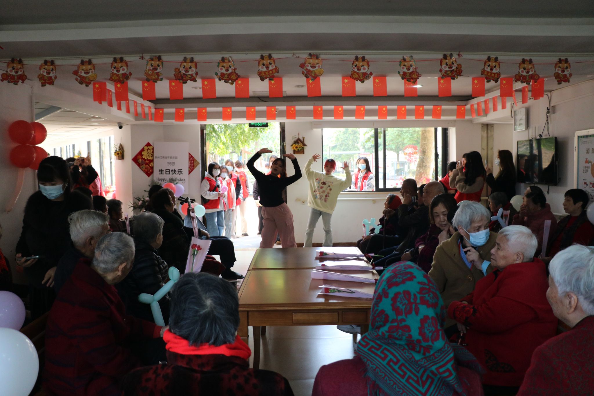 在园里,志愿者与社工一同布置场地,组织开展了一场“庆祝长者季度生日暨妇女节”活动,大家热情地为老人们表演节目,开心地陪伴老人聊天,倾听老人的故事和心声,关心老人的身体状况,与老人们一起做手工等。有的志愿者主动帮忙打扫卫生、整理房间,为老人们创造一个整洁舒适的居住环境。志愿者们用自己朴实的行动表达着对老人们的关爱,老人们脸上挂满了幸福的笑容,现场洋溢着欢乐祥和的气氛。