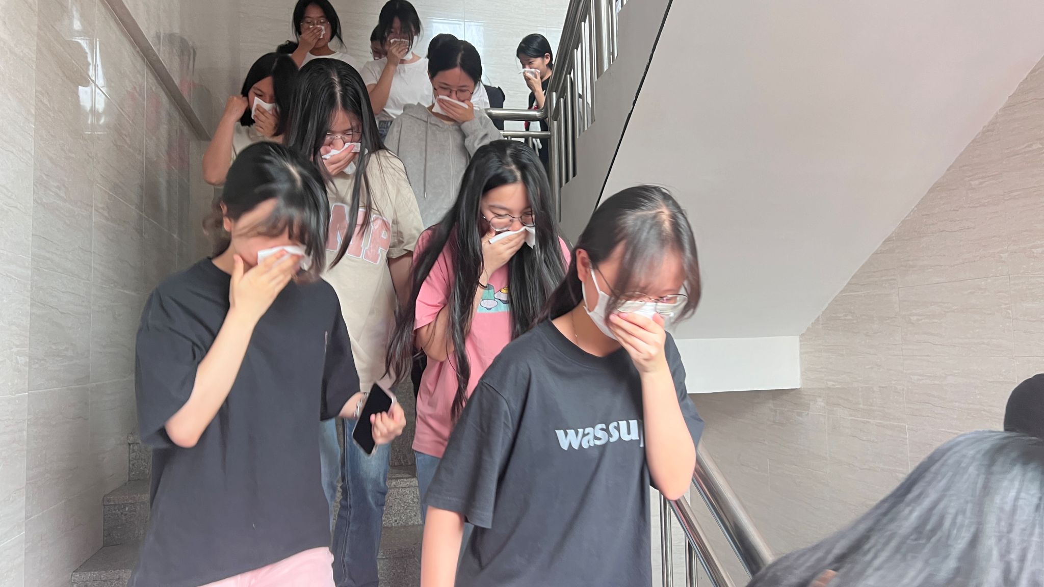 伴随着10#学生宿舍楼内浓烟的弥漫和急促的警报声,应急疏散演练正式开始。10#3、4、10、11层我系全体同学在各楼层辅导员及工作人员的引导下,沿着预定的疏散路线,用湿毛巾或手帕捂住嘴鼻,紧贴墙根,躬身前行,快速有序地撤离宿舍区域,到达指定安全地带,随即辅导员、工作人员对学生进行了人数清点并上报至指挥部,整个演练过程安全、迅速、井然有序,达到了预期效果。