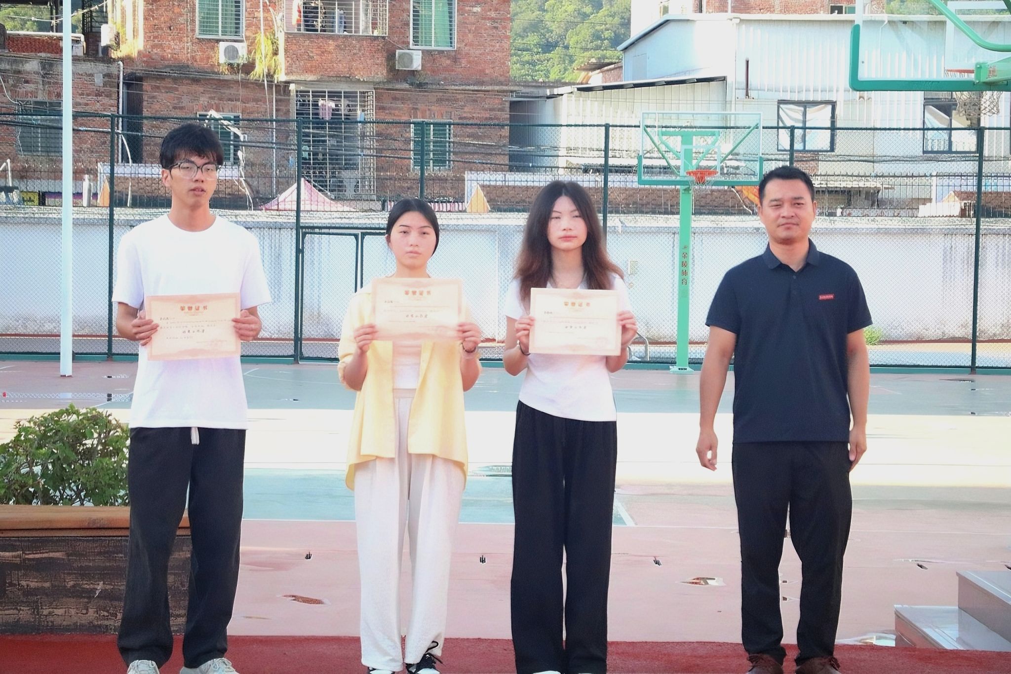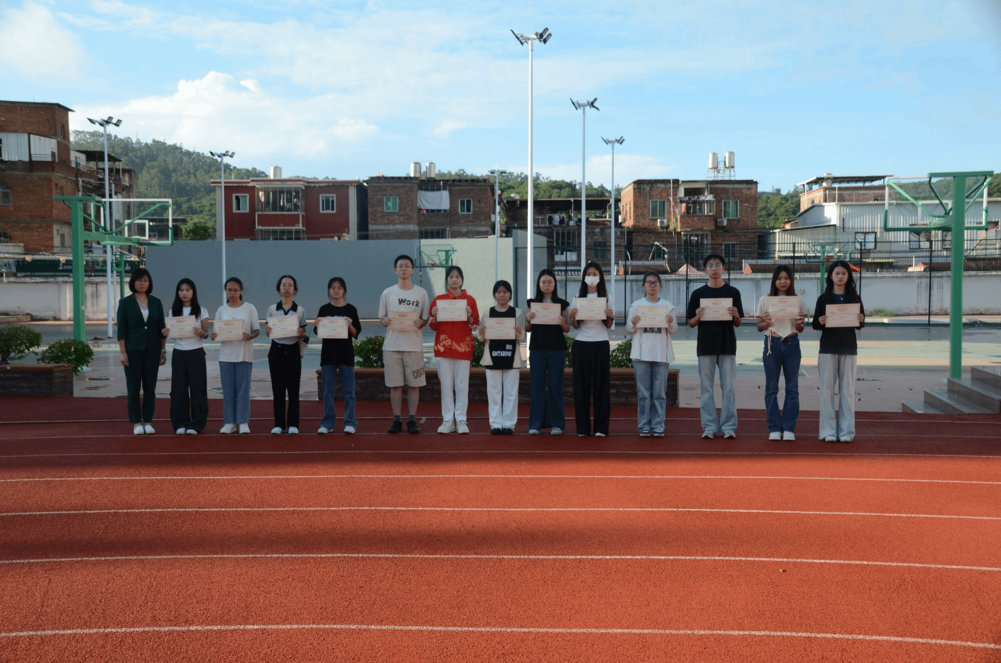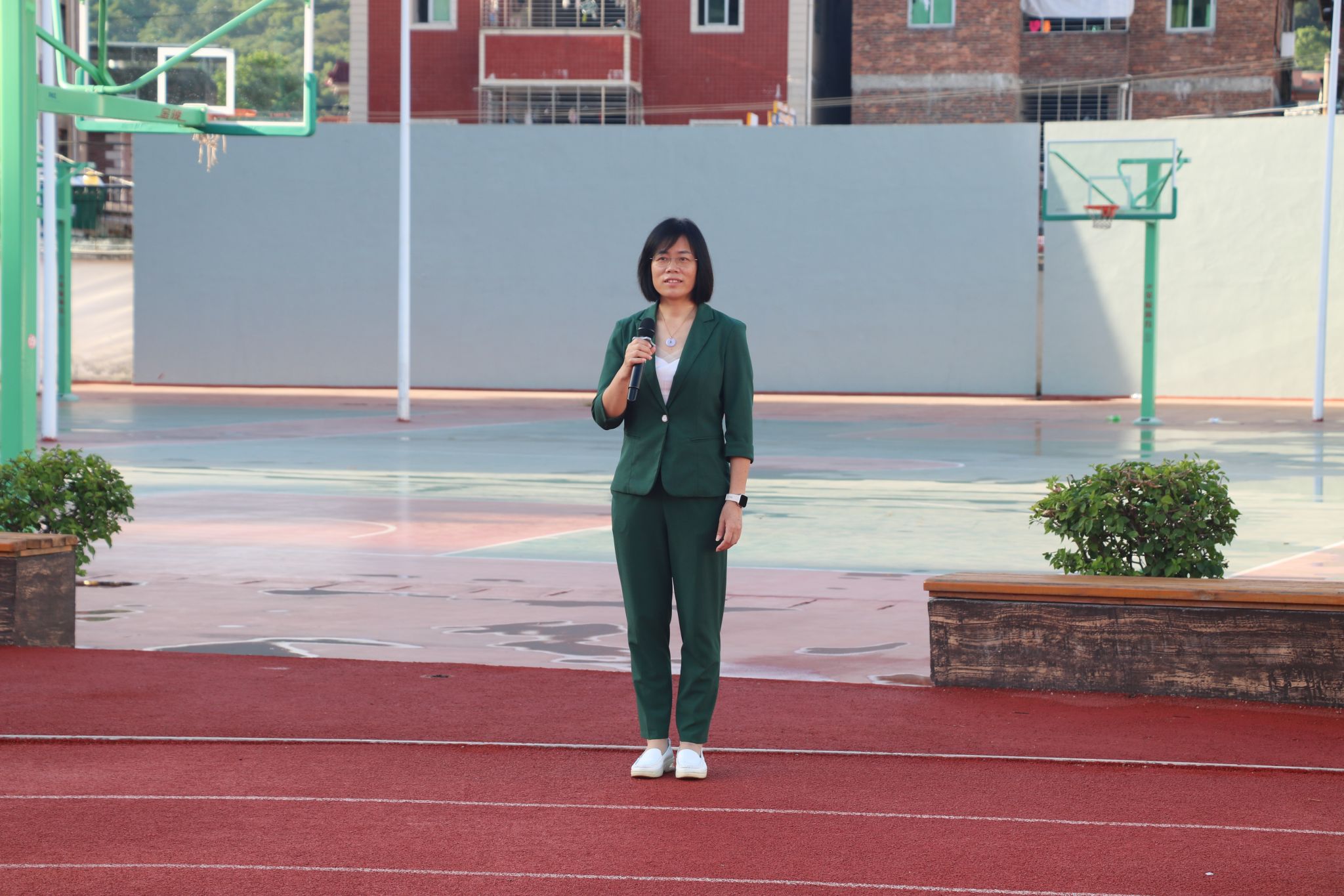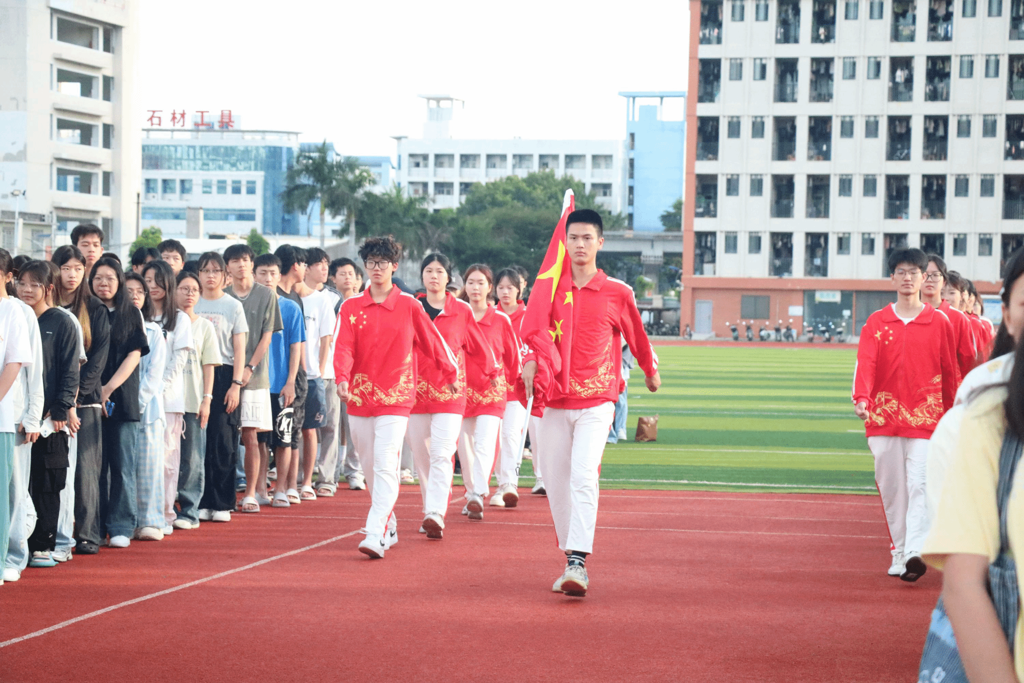 国旗护卫队迈着整齐的步伐,护送鲜艳的五星红旗至升旗台。在庄严嘹亮的《义勇军进行曲》中,国旗冉冉升起,全体师生面向红旗行注目礼,共唱国歌。