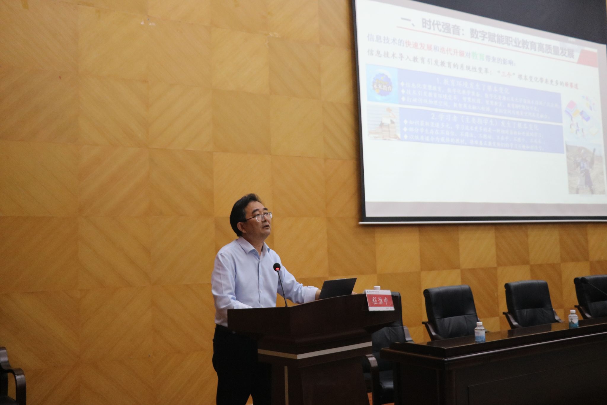 仪式结束后,程淮中教授作《数字赋能“双高”建设、聚力教育教学成果培育》专题报告。他以“双高”院校建设为风向标,结合高职教育建设和发展实际,聚焦数字赋能职业教育高质量发展,对国家级教学成果奖的培育和产业学院建设进行了深入细致的解读,还以案例“数智化云财会‘课岗赛证’融通教改的创新与实践”向教师们讲解了职业教育的新赛道,分享了教学教研的新思路。程教授的精彩报告受到了与会教师的广泛好评,大家表示通过本次学习,对教学成果奖的培育和“高水平专业群建设”有了更加深入的认识和理解,对未来的教学和专业发展有了更多思考。