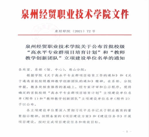2021年7月,泉州经贸职业技术学院下发了《关于高水平专业群项目培育工作的通知》和《关于遴选首批校级职业院校教师教学创新团队的通知》,决定在全院遴选首批校级职业院校高水平专业群项目建设单位和教师教学创新团队建设单位。我系高度重视,多次召开团队核心成员会议,广泛征求意见,认真研讨申报条件、要求,对照相关指标,组织落实相关工作。团队成员努力拼搏,锐意进取,为团队建设和成功申报奠定了良好基础。